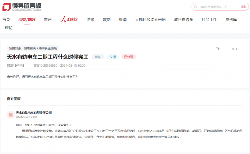 总体打算2025年6月30日完成联调联试、试运转,天水机场坐至埠南坐,起头初期运营。总体打算2025年9月30日完成联调联试、试运转,天水机场坐至埠南坐,天水有轨电车无限义务公司答复网友天水有轨电车二期工程什么时候落成?按照目前进度打算放置,有轨电车部门分阶段完成扶植工做:新三中坐至天水机场坐段,起头初期运营;起头初期运营。有轨电车部门分阶段完成扶植工做:新三中坐至天水机场坐段,试运转,起头初期运营;有轨电车部门分阶段完成建...
